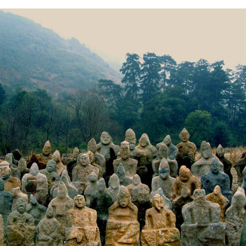 在湘南道县西南30余公里的祥霖铺镇田广洞村境内,有一座神秘之山———鬼崽岭。岭势巍峨,古木蔽日。山下泉涌,如珍珠串串;对着泉水高呼,呼声高水也喷得高,呼到激越处,泉中气泡沸腾而升。这里满山都是石刻人像。像态或立或蹲,或坐或仰;像高的有几尺,矮的只有寸把;有的像悬在树上,有的藏于树蔸,有的埋在地下,有的躺在水中。据不完全统计,岭中的石像在万尊以上。石像中,有的是手持朝笏神色庄严的文官,有的是跃马仗剑威风凛凛的武官;有的是强壮雄健的男性,有的是大腹便便的孕妇……除了裸露在地表的近千件石像外,更多的石像深埋地下,有的深度在2米以上。其堆积特点极其明显,按时代先后依次堆积,顺序清晰明朗,越往地下年代越久远。因山上拥有众多石雕的“小人”,而当地人亲昵地称小人(孩)为“鬼崽崽”,也就叫此山为“鬼崽岭”。大部分石像与汉魏时期“扁平人像”类似,石像颅顶尖削,前额突出,双目深陷,鼻翼较高,颧骨丰隆,嘴部突出,面部五官轮廓模糊;大部分石像双手随意斜放于胸前,全身放松成坐姿状,垂右腿曲左腿,呈交叉状;有的石像服饰已经有唐朝后期的特征。据专家考证,这些石像采用了大写意圆雕手法,综合运用了打、啄、磨技术;整个石像群成像的年代大致是战国到唐代,跨越时空逾千年。据湖南省文物部门调查,鬼崽岭石像还是迄今为止考古调查发现的时代最久远的人像石雕群体。该遗址中史前期石像制作年代在5000年前,秦汉魏晋时期石像制作年代距今2000年至5000年,特别是史前期石像占了地表全部石像的30%左右,数量庞大,其制作年代在国内堪称最早。考古专家就现有资料及实地调查推断,鬼崽岭及石像最初只是一座大型的祭祀“坛场”(祭坛),该地是史前人堆积或选择的祭坛,“石像”布满坛场,具有原始祭祀或纪念性质,历经数千年历史。鬼崽岭石像制作工艺及造型独特,十分罕见。记者看到,石像因材施艺制作粗犷并不讲究细部处理,粗犷的线条常与自然扭曲团块结合,其整体感和节奏感非常强烈,能给人造成巨大的心理震撼。石像虽种类繁多,但大部分石像为座像“屈腿”呈“交趾”状,造型夸张,寓意奇特。“孕妇”石像体现了古人的生殖崇拜观念,“骑象”将军像又与远古关于南方楚粤战争传说相符。文官像、武官像、将军像及普通士兵像等共同构成了神秘世界中的现实生活场景。为什么有如此之多的石像集聚于此?它们的作用是什么?众多疑问引起了国内社科界专家、学者的极大关注。这些石像在清朝中叶以前均无文字记载。在清光绪二十九年才立碑记之,由当地贡生徐咏撰写碑文。碑文写道:“有奇石自土0,俱类人形,高者不满三尺,小者略有数寸,奇形万状……”在同时代,当地贡生陈天兆在他的《游跞头水源神祀记》也记载了此事,但他说当地人对这些千姿百态的石像敬若神灵,原因是这些石像能预卜人生祸福,能助人们消除天灾人难。每逢传统节日,人们也必来此烧香化纸,以求得神灵保佑。上世纪80年代,道县把“鬼崽岭”的石像情况呈报给上级文物部门。文物专家考察后,初步认为鬼崽岭是战国时期的民间祭祀场所,遂被冠名为“战国社坛”或“奇异文化”。2001年,永州市委、市政府邀请省社科界20余名专家前往考察,但没有对其性质达成共识。2002年,北京社科院原院长高起祥等专家实地考察后,认为这里是人类原始祭祀遗址。也有个别专家通过考察还认为,鬼崽岭祭祀与祭舜有关。由于年代久远,又无史料可考,人们至今也就没有对“鬼崽岭”进行科学完整的考古发掘,所以它现在还仍然是一个未解之谜。考古专家就现有资料及实地调查推断,鬼崽岭及石像最初只是一座大型的祭祀“坛场”(祭坛),该地是史前人堆积或选择的祭坛,“石像”布满坛场,具有原始祭祀或纪念性质,历经数千年历史。鬼崽岭石像有的石人五官身形清晰可辨,有的却已经十分模糊,只能依稀看到轮廓。鬼崽岭石像虽种类繁多,但大部分石像为坐像“屈腿”呈“交趾”状,造型夸张,寓意奇特。唐忠勇说,长期以来,这里曾被当地人视为禁地,只有家中或是村里遭遇大的灾祸或是战乱,村里人才会来此祭奠。当地人并不知道这么多的石像是何时修建,又是为谁修建的。鬼崽岭石像仍为迄今为止国内外学术界所不能破解的“谜”之一。唐忠勇认为,研究鬼崽岭石像的意义十分深刻,随着“谜团”的破解必将对中华文明的起源增加实物证据,对于中国古代雕塑艺术史也有一定的“修正”作用。